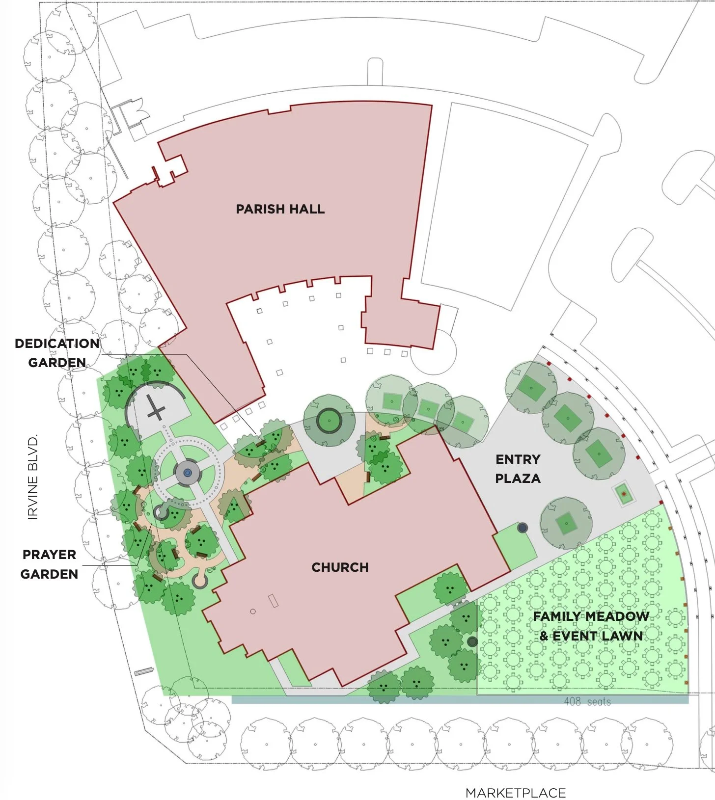 The exterior finishes will match the Tuscan style of our current campus. With landscaping that invites prayerful reflection on the site, the church will be prominent, featuring a 60 ft. tower facing the intersection of Marketplace and Irvine Blvd. Additionally, a prayer garden and a family meadow/ event lawn will round out our campus.